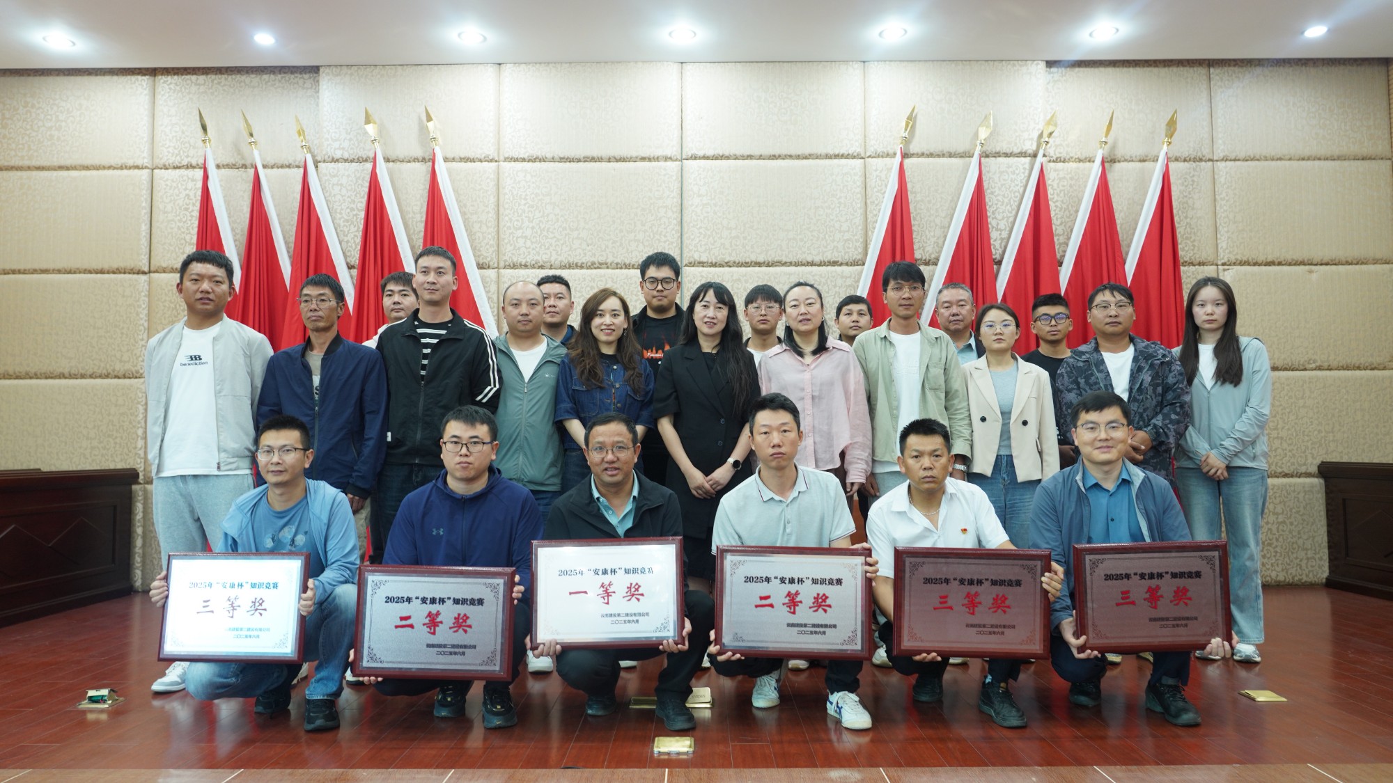 本次競賽采用集團“云南建投學(xué)習(xí)成長平臺”線上答題形式,旨在以賽促學(xué)、以賽促產(chǎn),提升全員安全生產(chǎn)意識,助推公司項目管理提質(zhì)增效。比賽中,各參賽隊嚴(yán)格遵守競賽規(guī)則,選手們?nèi)褙炞?、認(rèn)真答題,展現(xiàn)出了扎實的安全生產(chǎn)知識功底與嚴(yán)謹(jǐn)?shù)谋荣悜B(tài)度。經(jīng)過激烈的角逐,最終有6支隊伍脫穎而出。第十二直管部榮獲一等獎,第九直管部、市政分公司摘得二等獎,第一直管部、第六直管部、第七直管部獲得三等獎。公司領(lǐng)導(dǎo)分別為獲獎隊伍頒獎并合影留念。
