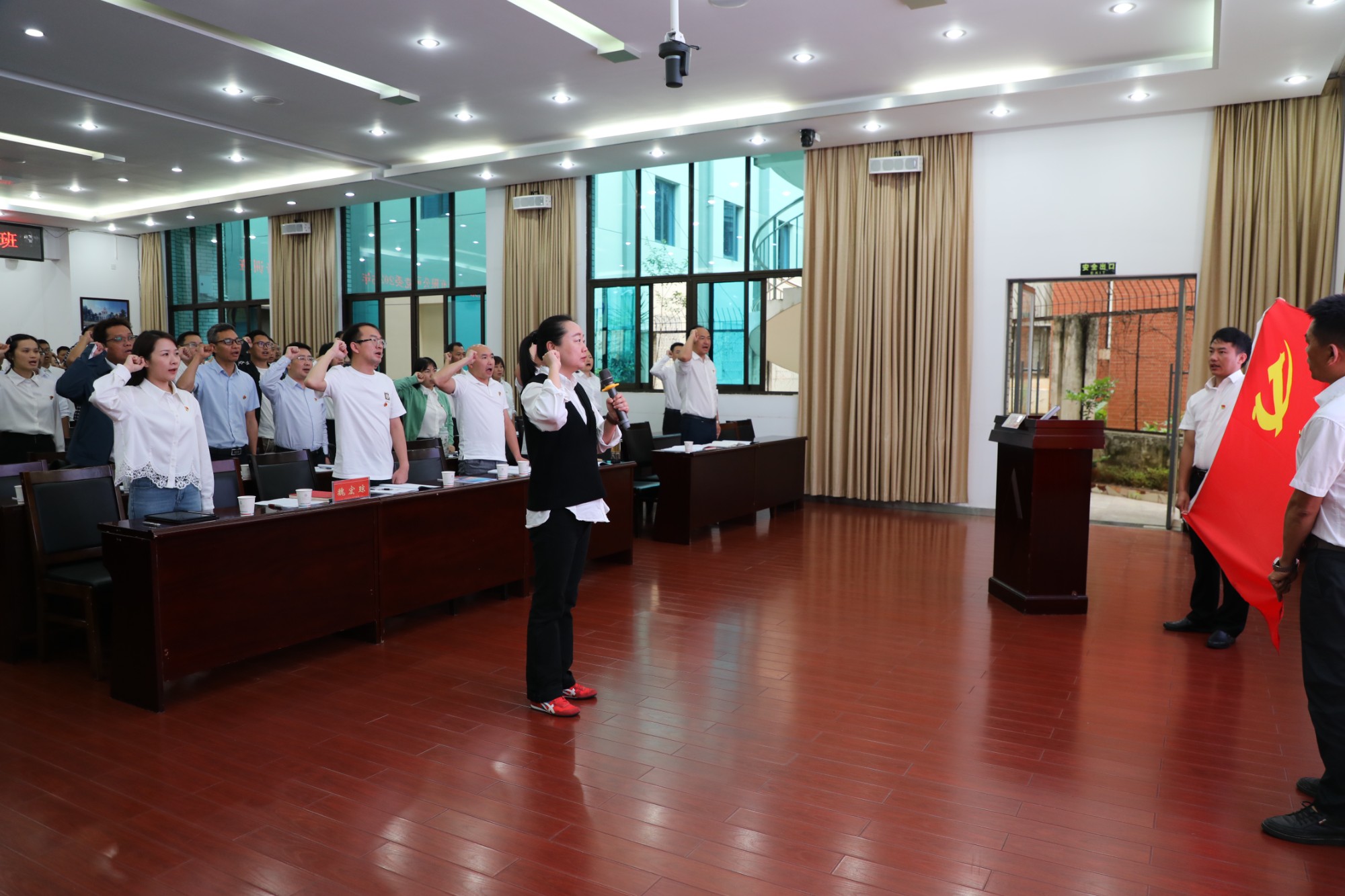 開班儀式上,全體參培人員共同唱響了《中華人民共和國(guó)國(guó)歌》,魏宏瓊帶領(lǐng)全體參培黨員重溫了入黨誓詞,并作開班動(dòng)員講話。