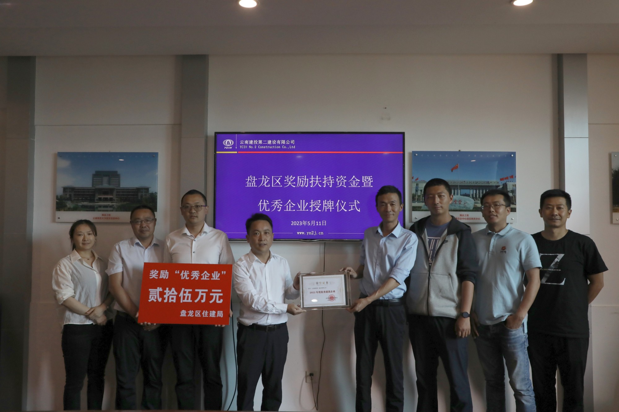 會上,與會雙方就行業(yè)發(fā)展情況進行了交流,盤龍區(qū)住建局為公司頒發(fā)了“2022年度優(yōu)秀建筑企業(yè)”榮譽證書和獎勵扶持資金支票,并進行合影留念。