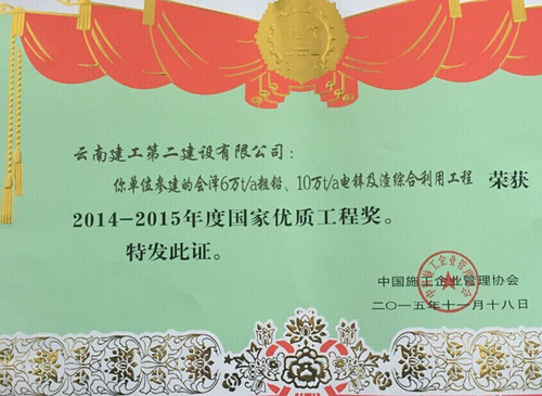 12月18日,在北京舉行的2014—2015年度創(chuàng)建國家優(yōu)質(zhì)工程總結(jié)表彰大會上,由公司參建的會澤馳宏鋅鍺6萬t/a粗鉛、10萬t/a電鋅及渣綜合利用工程榮獲2014—2015年度“國家優(yōu)質(zhì)工程銀質(zhì)獎”,公司董事長陳定華獲得2014—2015年度“國家優(yōu)質(zhì)工程獎突出貢獻者”稱號。